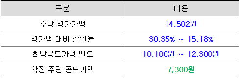 당초 희망 공모가격 하단 10,100원 대비 2,800원 (27.72%) 하향 조정된 가격입니다.
