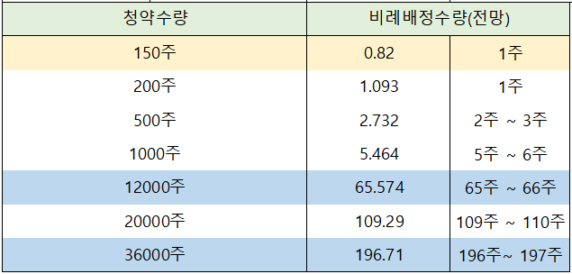 일반 청약자의 초고 청약 한도인 12,000주까지 청약 신청한 경우에는 65주 ~ 66주 배정이 예상되고, 우대 등급의 최고 청약 한도인 36,000주까지 풀 청약 신청한 경우에는 196주 ~ 197주 배정이 전망됩니다.