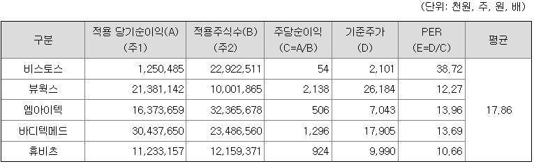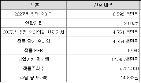 회사의 주당 평가가액은 2027년 추정 순이익을 할인하여 현재가치로 환산한 후, 유사회사의 평균 PER배수를 곱하여 회사가치를 정하고, 이를 주식 수로 나누어 신출한 것입니다.
