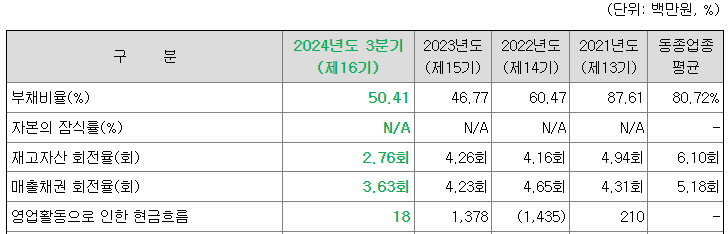 파인메딕스는 2022년 및 2023년 매출 증가에 따라 유동자산이 증가하였으며, 차입금 및 전환사채를 상환함에 따라 동사의 부채비율은 크게 개선되어 현재 동 업종 평균 대비 낮은 부채비율을 형성하고 있습니다.
