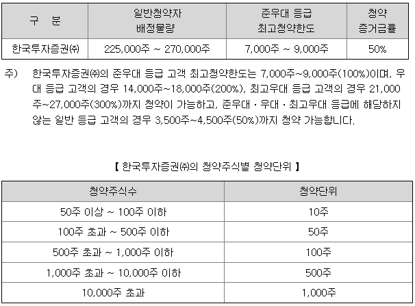 한국투자증권의 일반 청약자 배정 물량은 225,000주 ~ 270,000주이고, 일반 청약자의 최고 청약 한도는 일반 등급 기준 3,500주 ~ 4,500주입니다.