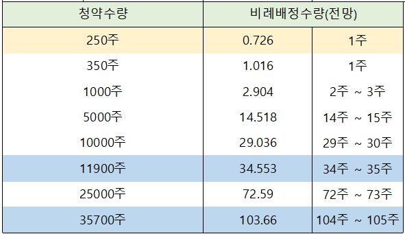 비례배정의  경우 1주 배정을 기대해 볼 수 있는 커트라인은 250주로 전망되고 있습니다.