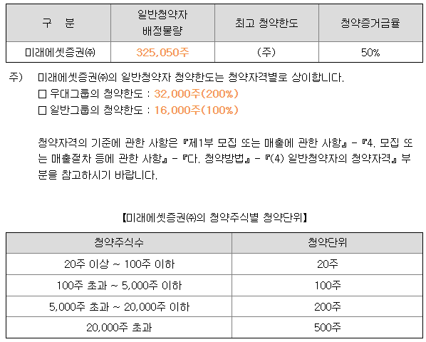 미래에셋증권의 일반 청약자 배정 물량은 325,050주이고, 일반 청약자의 최고 청약 한도는 일반그룹 기준 16,000 주입니다.
