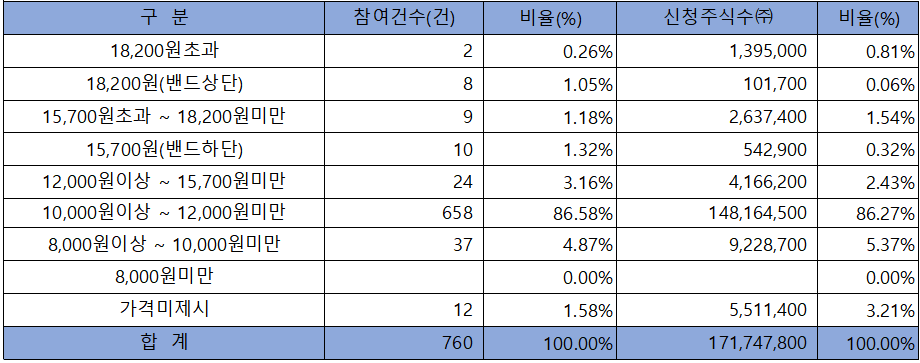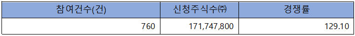 수요예측 참여 건수는 총 760건에 신청 주식수 171,747,800주로, 참여 경쟁률 129.10 : 1의 실적을 기록했습니다.
