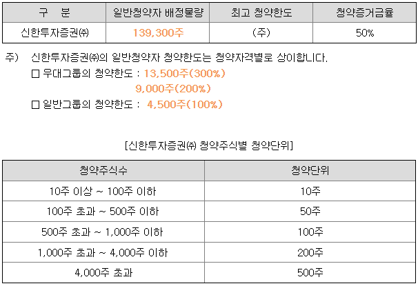 신한투자증권의 일반 청약자 배정 물량은 139,300주이고, 일반 청약자의 최고 청약 한도는 일반그룹 기준 4,500 주입니다.