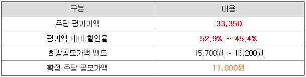 당초 희망 공모가격 하단 15,700원 대비 4,700원(29.93%) 하향 조정된 가격입니다.