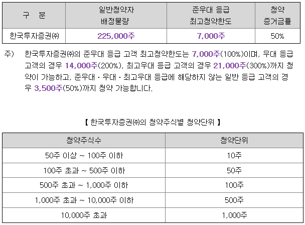 한국투자증권의 일반 청약자 배정 물량은 225,000주이고, 일반 청약자의 최고 청약 한도는 일반 등급 고객 기준 3,500주입니다.