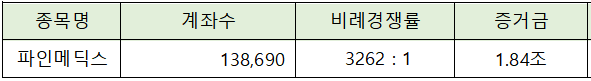 파인메딕스의 청약에는 1.84조원의 증거금이 모이면서 3,262 : 1의 비례 경쟁률을 나타냈습니다.