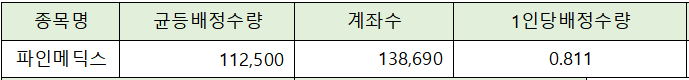 균등배정은 총 138,690 계좌가 청약에 참가해 균등 배정 수량 112,500주를 감안하면 1인당 0.811주가 배정될 것으로 전망되고 있습니다.
