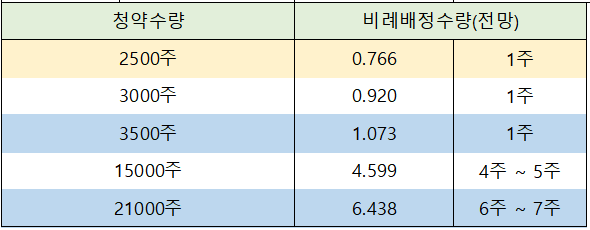 한편, 우대 등급의 최고 청약 한도인 21,000주까지 풀 청약 신청한 경우에는 6주 ~ 7주 주 배정이 예상됩니다.