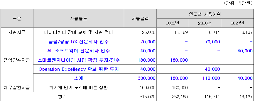 LG CNS는 금번 공모를 통해 조달된 자금으로 데이터센터 장비 교체 등 시설 자금으로 250억, 타 법인 영업 양수 자금으로 3,300억을 사용하고 나머지 1,600억으로 회사채를 만기 상환할 예정입니다.