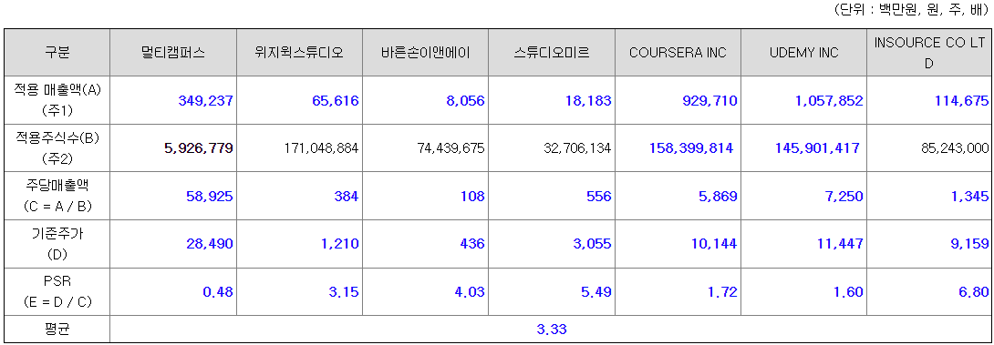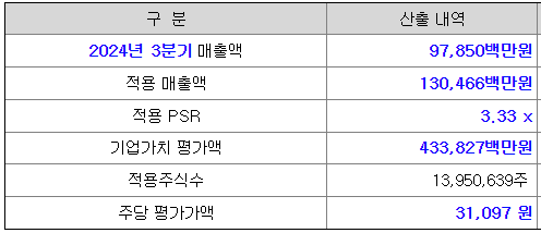 회사의 주당 평가가액은 2024년 3분기까지 매출액을 연간 환산한 후, 유사회사의 PSR(주가매출액비율) 배수를 곱하여 회사가치를 정하고, 이를 주식 수로 나누어 산출한 것입니다.