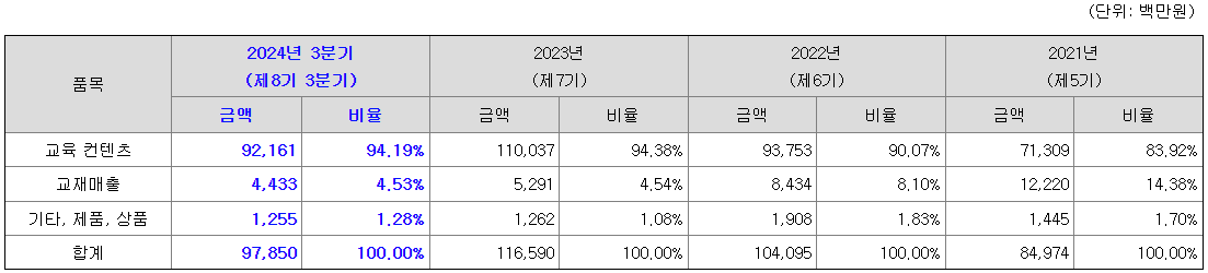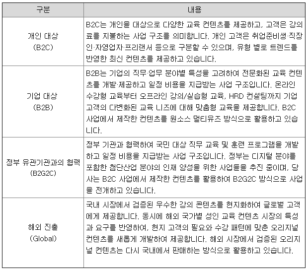 예를 들어, 개인 고객 중 취업 준비생의 경우 취업을 목적으로 부트캠프 형식의 풀타임 교육을 희망하는 반면, 직장인의 경우 원하는 때에 자유롭게 수강 가능한 온라인 강의를 선호합니다. 또한 직장인은 디지털 트랜스포메이션 트렌드에 맞춰 직무 역량을 향상하기 위해 테크 분야의 컨텐츠를 선호하나, 자영업자·프리랜서의 경우 디자인 혹은 쿠킹·헤어 등 라이프스타일 분야의 컨텐츠를 희망합니다. 이와 같이 세분화된 시장 각각에서 경쟁우위를 확보하기 위해서는 사업 영역 별로 최적화된 조직 구성 및 전략 실행이 필요합니다. 이에 당사는 각자 독립된 사업체로 기능하는 4개의 사내독립기업(Company In Company)을 운영하고 있으며, 이는 타사 대비 당사만의 가장 큰 차별점이기도 합니다. 각 4개의 사내독립기업에 대한 특성은 아래와 같습니다.
