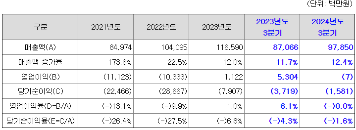 반면, 2024년 3분기에는 영업손실이 7백만원, 당기순손실이 16억원 발생하였는데 이는 2024년 브랜딩캠페인을 진행하면서 39억원 가량의 마케팅비를 일시적으로 지출하였기 때문입니다.
