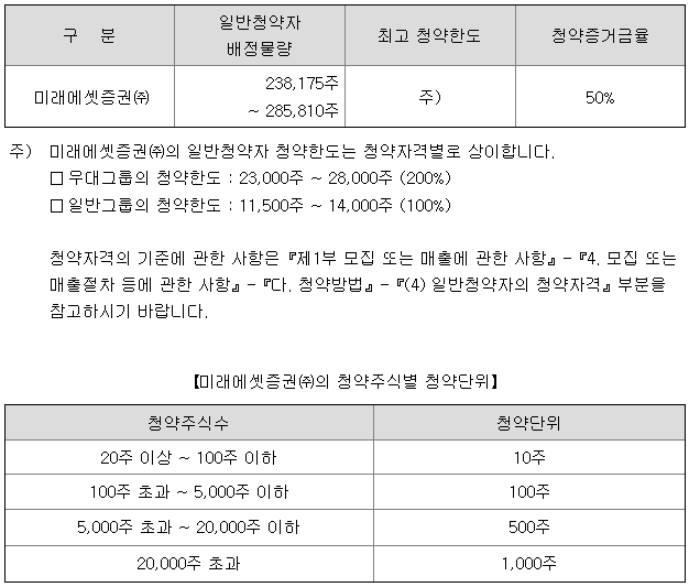 미래에셋증권의 일반 청약자 배정 물량은 238,175주 ~ 285,810주이고, 일반 청약자의 최고 청약 한도는 일반그룹 기준 11,500주 ~ 14,000주입니다.