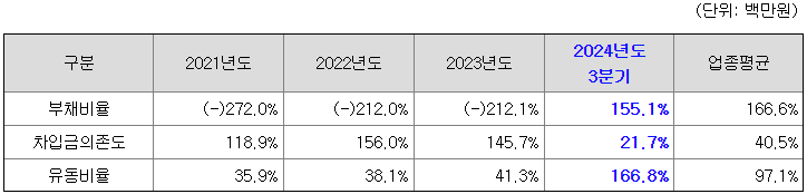 동사의 연결재무제표 기준 부채비율은 2021년 -272.0%, 2022년 -212.0%, 2023년 -212.1%로 업종평균(166.6%) 대비 열위한 수준을 기록하고 있으나, 2024년 3분기 155.1%로 업종평균과 유사한 수치를 보이고 있습니다. 이는 2024년 상환전환우선주의 보통주 전환에 따른 부채 감소 및 자본잠식 해소에 기인합니다.