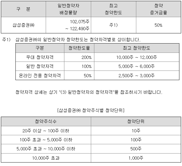 삼성증권의 일반 청약자 배정 물량은 102,075주 ~ 122,490주이고, 일반 청약자의 최고 청약 한도는 온라인 전용 기준 2,500주 ~ 3,000주입니다.