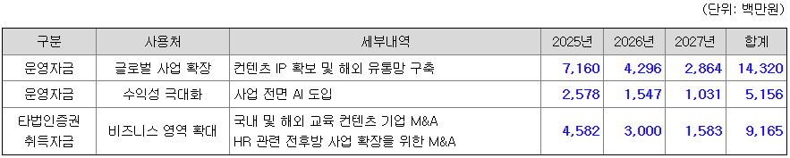 데이원컴퍼니는 금번 공모를 통해 조달된 자금으로 사업 영역 확대를 위한 타 법인증권 취득에 92억을 사용하고, 나머지 194억을 글로벌사업확장 등 운영자금으로 사용할 계획입니다.