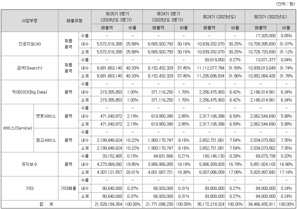이러한 끊임 없는 도전을 통한 축적된 기술력, 사업 노하우, 고도의 전략적 경영능력은 수익성 중심의 사업전개와 질적 성장에 기여했으며, 이 결과 2024년 3분기(25기 3분기)에는 매출 215억원을 달성했습니다. 당사는 인공지능 챗봇 제품과 검색 제품을 중심으로 해당 분야에서 국내 TOP.1 기업으로 인정받고 있으며, 당사의 RAG솔루션 또한 기하급수적으로 커져가는 생성형 AI 시장에 공급함으로써 미래 성장 동력으로서의 성장 전략을 구사하고 있습니다.