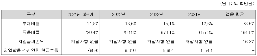 와이즈넛의 부채비율은 2021년 12.6%, 2022년 15.1%, 2023년 13.6%, 2024년 3분기 14.8%로 업종평균 대비 낮은 부채비율을 유지하고 있으며, 견고한 회사 실적 및 일정 비용 수준을 유지하며 2021년 이후 낮은 부채비율 수준을 유지하고 있습니다. 차입금 비율 역시 2021년도 이후 발생하지 않아 별도의 차입금 의존도는 없습니다. 영업활동 현금흐름은 2024년 3분기 일시적 음(-)의 현금흐름이 발생했으나, 2021년~2023년 동안 양(+)의 현금흐름을 보여주고 있습니다. 2024년 3분기 음(-)의 현금흐름은 당기순손실로 인식한 (-)18억원으로 인해 일시적으로 발생하였으며 2024년 온기 기준으로 개선될 것으로 예상하고 있습니다.