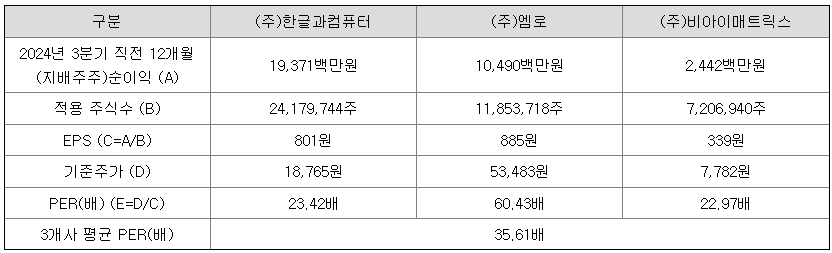 회사의 주당 평가가액은 2026년 추정 순익익을 할인하여 현재가치를 구한 다음, 유사회사의 평균PER배수를 곱하여 회사가치를 정하고, 이를 주식 수로 나누어 산출한 것입니다.