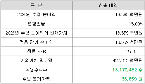 회사의 주당 평가가액은 2026년 추정 순익익을 할인하여 현재가치를 구한 다음, 유사회사의 평균PER배수를 곱하여 회사가치를 정하고, 이를 주식 수로 나누어 산출한 것입니다.