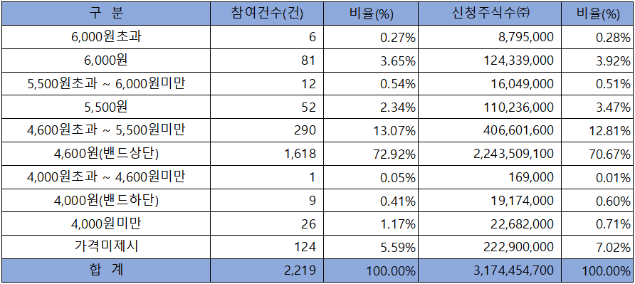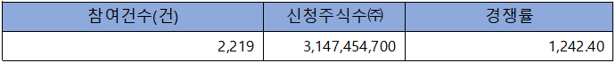 수요예측 참여 건수는 총 2,219건에 신청 주식수 3,147,454,700주로, 참여 경쟁률 1,242.40 : 1의 실적을 기록했습니다.