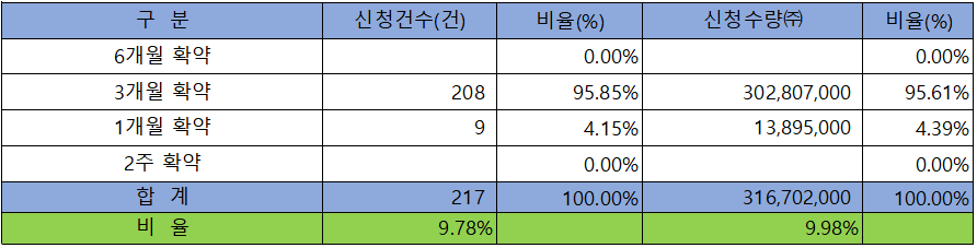 의무 보유 확약 건수는 217건에 316,702,000주로 전체 신청 물량 대비 건수로는 9.78%, 수량으로는 9.98%였으며, 3개월 확약 비중이 제일 높았습니다.
