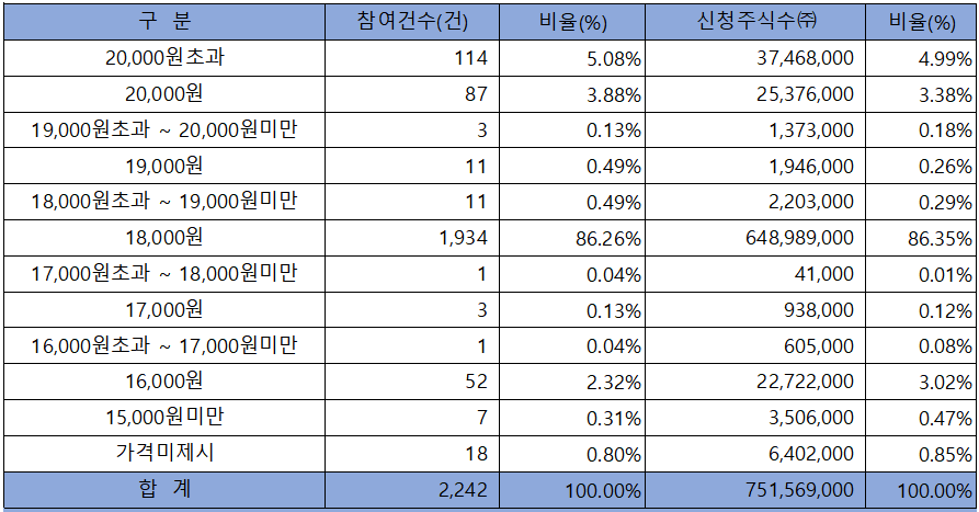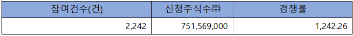 수요예측 참여 건수는 총 2,242건에 신청 주식수 751,569,000주로, 참여 경쟁률 1,242.26 : 1의 실적을 기록했습니다.
