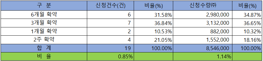 의무 보유 확약 건수는 19건에 8,546,000주로 전체 신청 물량 대비 건수로는 0.85%, 수량으로는 1.14%였으며, 3개월 확약 비중이 제일 높았습니다.