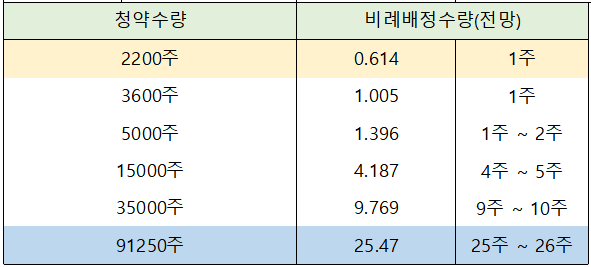 일반 청약자의 최고 청약 한도인 91,250주까지 풀 청약 신청한 경우에는 25주 ~ 26주 배정이 예상됩니다.