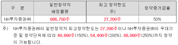 - 청약 가능 증권사 : NH투자증권