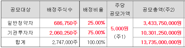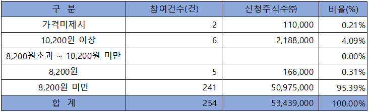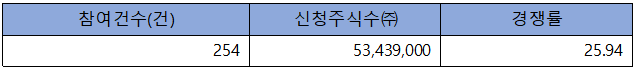 수요예측 참여 건수는 총 254건에 신청 주식수 53,439,000주로 경쟁률 25.94 : 1의 아주 저조한 실적을 기록했습니다.