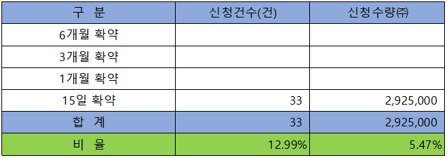 의무 보유 확약 건수는 33건에 2,925,000주로 전체 신청 물량 대비 건수로는 12.99%였으나, 수량으로는 5.47%에 불과했으며, 더욱이 15일 보유 확약 신청 100%로 내용도 좋지 않습니다.