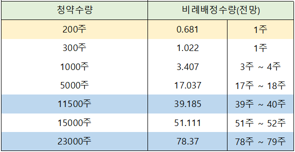 그다음 40주를 신청한 경우 거의 확실하게 2주를 받을 수 있고, 100주를 신청한 경우 4주 ~ 5주를 배정받을 수 있을 것으로 전망되고 있습니다.