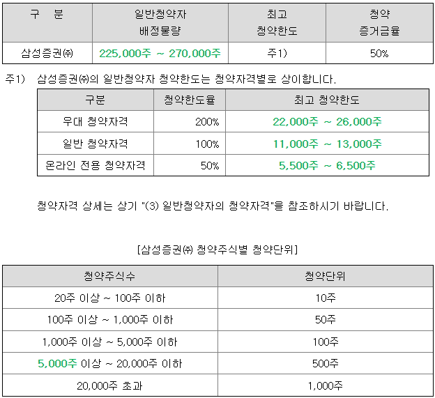 삼성증권의 일반 청약자 배정 물량은 25,000주 ~ 270,000주이고, 일반 청약자의 최고 청약 한도는 온라인 전용 고객 기준 5,500주 ~ 6,500주입니다.
