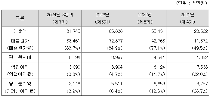 2021년~2022년에는 10% 이상의 영업이익률을 기록하였으나, 확대되는 고객사의 신규수주 물량 대응을 위해 2023년 인력을 다수 확충함에 따른 영향과 고객사의 투자지연으로 인한 AI 비전 및 데이터 기반 스마트팩토리 솔루션 매출의 정체로 인하여 전년대비 이익이 축소되었습니다. 2024년 3분기에는 31억원을 달성하였으며 전 3분기 (-)25억원과 비교하여 흑자로 전환하였습니다. 동사는 고정비 레버리지 효과가 존재하는 만큼 4분기 매출 증가세에 따라 영업이익률 또한 개선될 것으로 전망하고 있습니다.