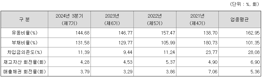 지속적인 당기순이익과 2022년 150억원 유상증자 등의 사유로 발생하는 현금 유입 및 매출채권 등의 증가로 유동자산이 증가하였으나, 선수금 부채 인식 규모 증가에 따라 유동비율이 소폭 감소하고 있습니다. 그에 따라 부채비율도 2022년 이후 지속적으로 증가하고 있습니다.