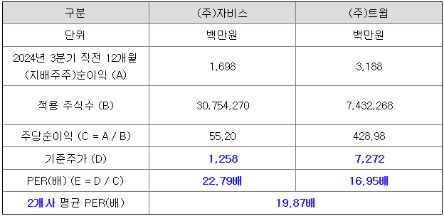 회사의 주당 평가가액은 2024년 3분기말 기준 직전 12개월의 순익을 주식 수로 나누어 주당 순이익을 구하고, 여기에 유사화사의 PER배수를 곱하여 산출한 것입니다.
