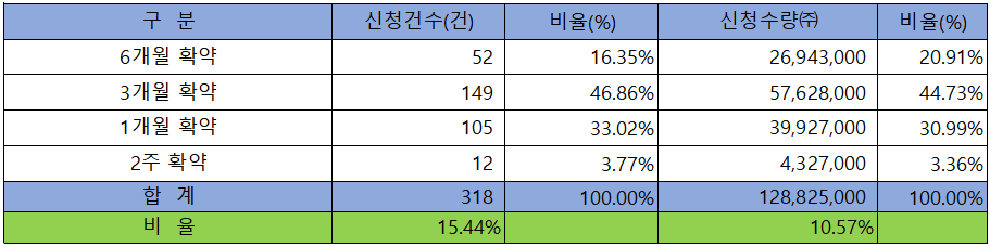 의무 보유 확약 건수는 318건에 128,825,000주로 전체 신청 물량 대비 건수로는 15.44%, 수량으로는 10.57%였으며, 3개월 확약 비중이 제일 높았습니다.