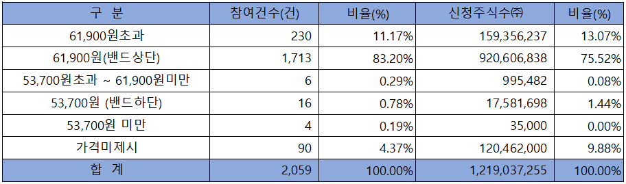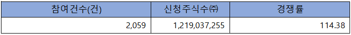수요예측 참여 건수는 총 2,059건에 신청 주식수 1,219,037,255주로, 참여 경쟁률 114.38 : 1의 실적을 기록했습니다.