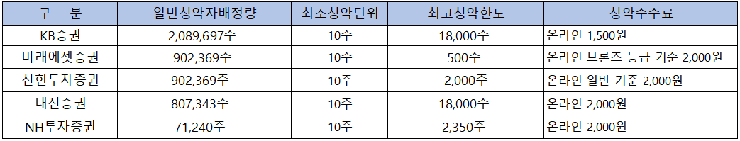 - 청약 가능 증권사 : KB증권, 미래에셋증권, 신한투자증권, 대신증권, NH투자증권