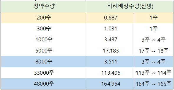 일반 청약자의 최고 청약 한도인 8,000주까지 청약 신청한 경우에는 3주 ~ 4주 배정이 예상되고, 우대등급의 최고 청약 한도인 48,000주까지 풀 청약 신청한 경우에는 164주 ~ 165까지 배정이 전망되고 있습니다.