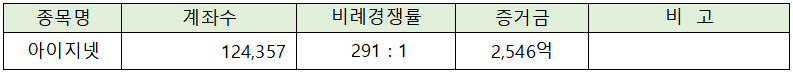 아이지넷의 청약에는 2,546억원의 증거금이 모이면서 291 : 1의 비례 경쟁률을 나타냈습니다.
