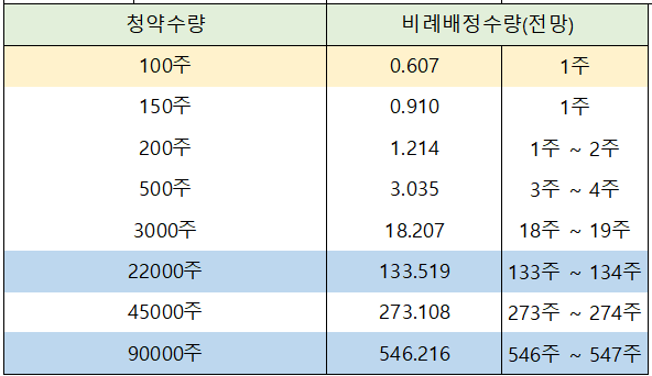일반 청약자의 최고 청약 한도인 22,000주 신청 시 133주 ~ 134주 배정이 예상되고, 우대 등급의 최고 청약 한도인 90,000주까지 풀 청약 신청한 경우에는 546주 ~ 547주 배정이 전망되고 있습니다.