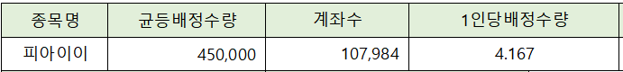 균등배정은 총 107,984 계좌가 청약에 참가해 균등 배정 수량 450,000주를 감안하면 1인당 4.167주가 배정될 것으로 전망되고 있습니다.