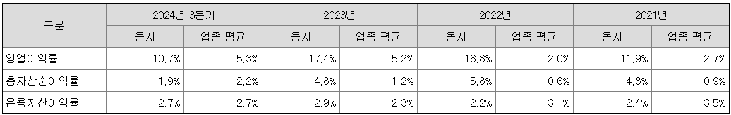 보험업계는 2008년 금융위기 이후 고착화된 저금리 기조에 2020년까지는 전반적으로 낮은 수익성을 기록하였고, 이후 글로벌 금리 상승 기조에 따라 수익성이 상승하는 모습을 기록하고 있습니다. 동사는 국내 유일의 전업 종합보증보험사로서 산업 내 독보적 지위와 축적된 리스크 관리 역량을 기반으로 타 손해보험사와는 차별화되며 안정적인 수익성을 달성하여 왔습니다. 다만, 최근 대외적 요인인 금리 인상, 부동산 경기 위축 및 글로벌 경제 여건 악화에 따라 보상이 증가하며 손해율이 악화되어 2022년을 정점으로 동사의 영업이익률은 감소하는 추세를 보이고 있습니다. 그러나 2024년 하반기 국내 및 글로벌 기준금리가 인하 추세에 접어듦에 따라 동사의 수익성은 다시 개선될 것으로 예상됩니다.