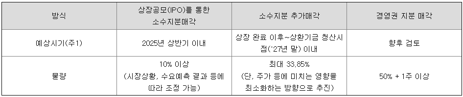 최대주주의 금번 공모 후 주식 수는 58,546,746주이고, 공모 후 지분율 83.85%이며, 소수 지분 추가 매각과 경영권 지분 매각 매각 추진 계획은 아래 표와 같습니다.