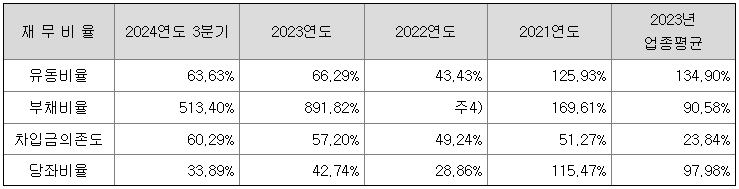 2021년 부채비율은 K-GAAP 기준 169.61%였으나, 이후 K-IFRS 전환으로 RCPS 평가 반영에 따른 금융부채 증가, 주식보상비용 인식, 시설 투자 등을 위한 차입금의 증가 등의 사유로 동사의 부채비율은 높은 편을 유지하고 있습니다. 2024년 제3자 배정 투자 유치에 따라 자기 자본이 증가하여 2024년 3분기 K-IFRS 기준 부채비율은 개선되어 513.40%를 기록하고 있습니다.