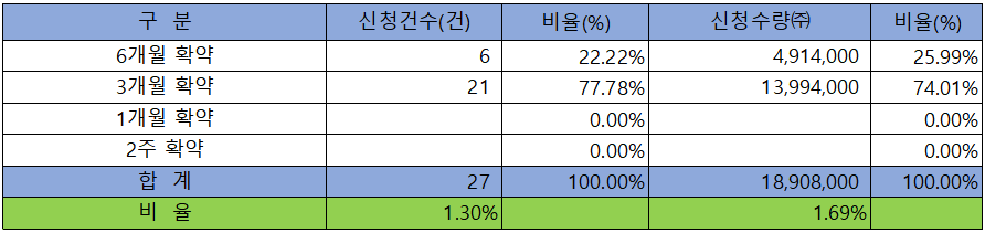 의무 보유 확약 건수는 27건에 18,908,000주로 전체 신청 물량 대비 건수로는 1.30%, 수량으로는 1.69%였으며, 3개월 확약 비중이 제일 높았습니다.